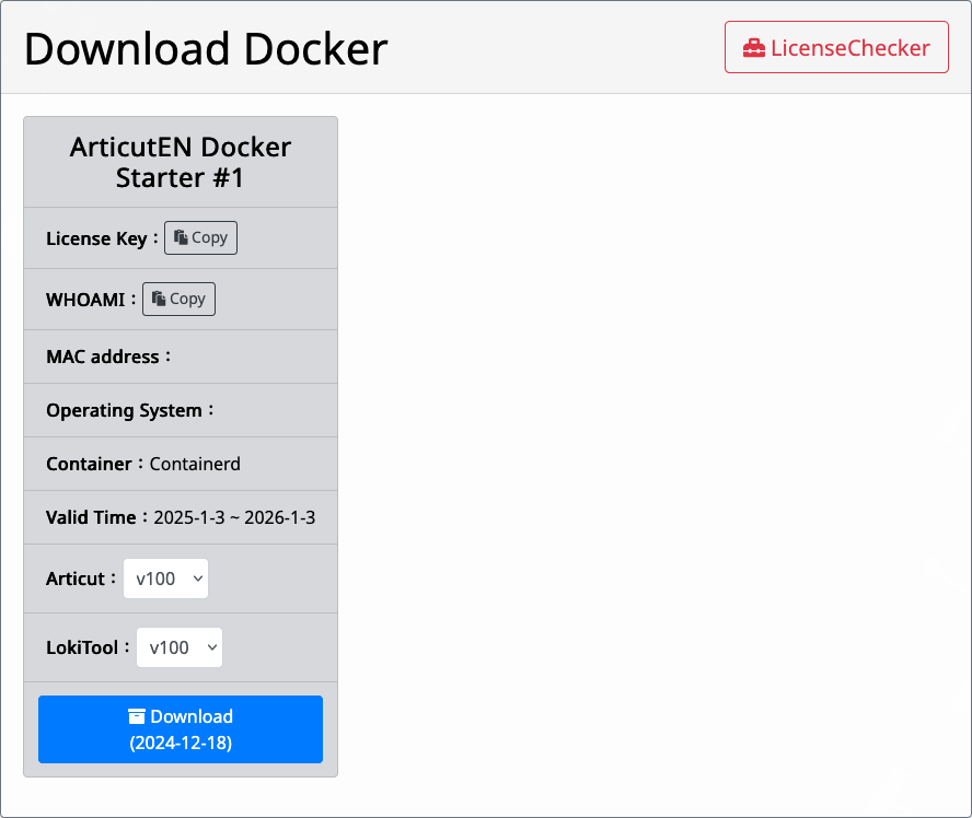 Please log in to your Droidtown API Member Profile, go to the Articut tab, and under the Docker Packaging section, check the [Launcher] option and select the versions of [Articut] and [LokiTool] you need. Then, click the Download button. (The file name will be ArticutDocker.zip)